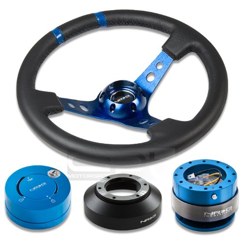 NRG-SRK-141H+200NB+101NB+016RBL, NRG Innovations 13.78" 350mm 3" Deep Dish Style Black Leather Blue Center Marking Blue Spokes Racing Steering Wheel Combo with 6 Hole Short Hub Adapter with Gen 2.0 New Blue Quick Release with New Blue Lock Hub Kit SRK-141H