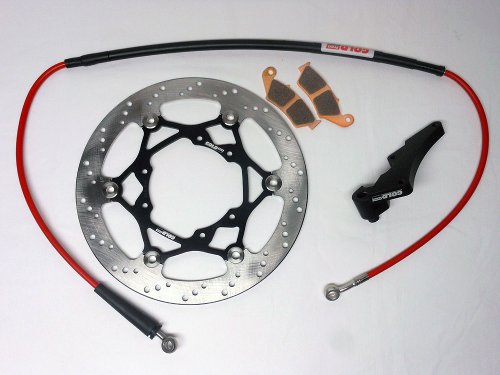 Includes racing stainless steel front oversized floating disc F with relocation bracket, racing sintered brake pads and braided mx red/black brake hose